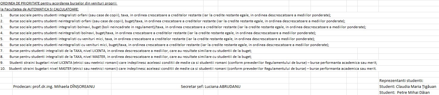 Conform Regulamentului de burse, fondul de burse alocat Facultatii de automatica si calculatoare a fost repartizat pe specializari si ani de studiu, proportional cu numarul de studenti bugetati cetateni romani, cetateni ai statelor membre ale Uniunii Europene, ai statelor apartinand SEECE.