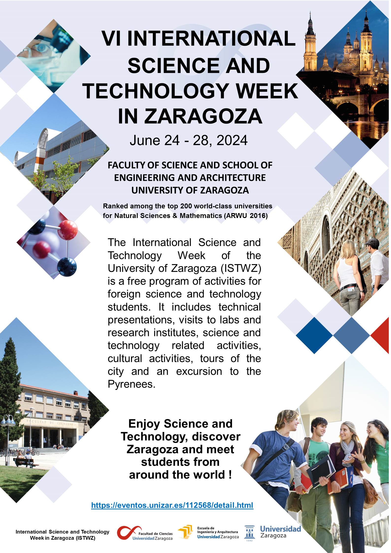 The Faculty of Science and the School of Engineering and Architecture of the University of Zaragoza are organizing the VI International Science and Technology Week (ISTWZ). It is a free program of activities aimed at inviting foreign science and technology students and exchange coordinators to get acquainted with the Faculty of Science and the School of Engineering and Architecture, as well as the university and the city of Zaragoza. The VI ISTWZ will be held at the University of Zaragoza, from 24th to 28th, June 2024. Events include technical presentations, visits to labs and research institutes, meetings with researchers, other science and technology related activities, cultural activities, tours of the city and and a visit to a research facility in the core of the Pyrenees. Registration and participation is free, and it includes accommodation for students, lunch and all activities related to the event. This will be the sixth edition of ISTWZ, after the great success of the 2017, 2018, 2019, 2022 and 2023 editions.