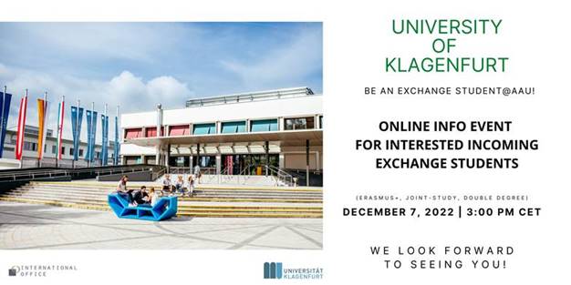 The International Office of the University of Klagenfurt is pleased to offer an online info event, "Exchange@AAU", for prospective incoming exchange students.