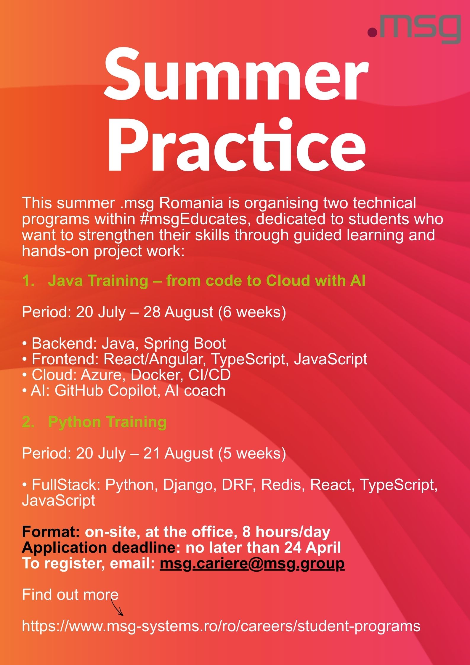 Perioada de desfasurare a practicii:  1 iulie 2026 – 30 septembrie 2026.